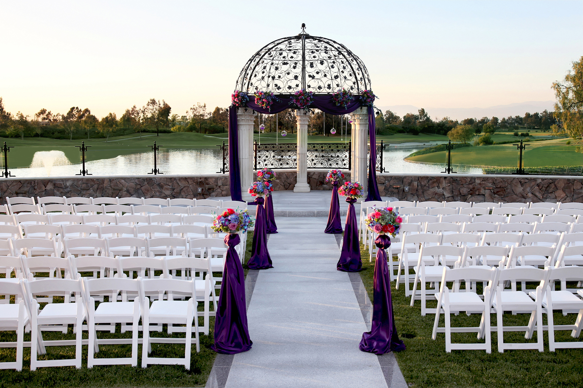 A pergola crown made of handcrafted wrought iron sits at the end of a manicured lawn that leans into the Seal Beach sky. The Earth seems to fall away and on all sides, a panoramic view of lush greens, sparkling fountains, distant mountains and sky forms around our couples. There is a natural majesty of the surroundings and the feeling that the whole world has taken pause for this special moment. This is the outdoor ceremony that every couple dreams of for their special day.